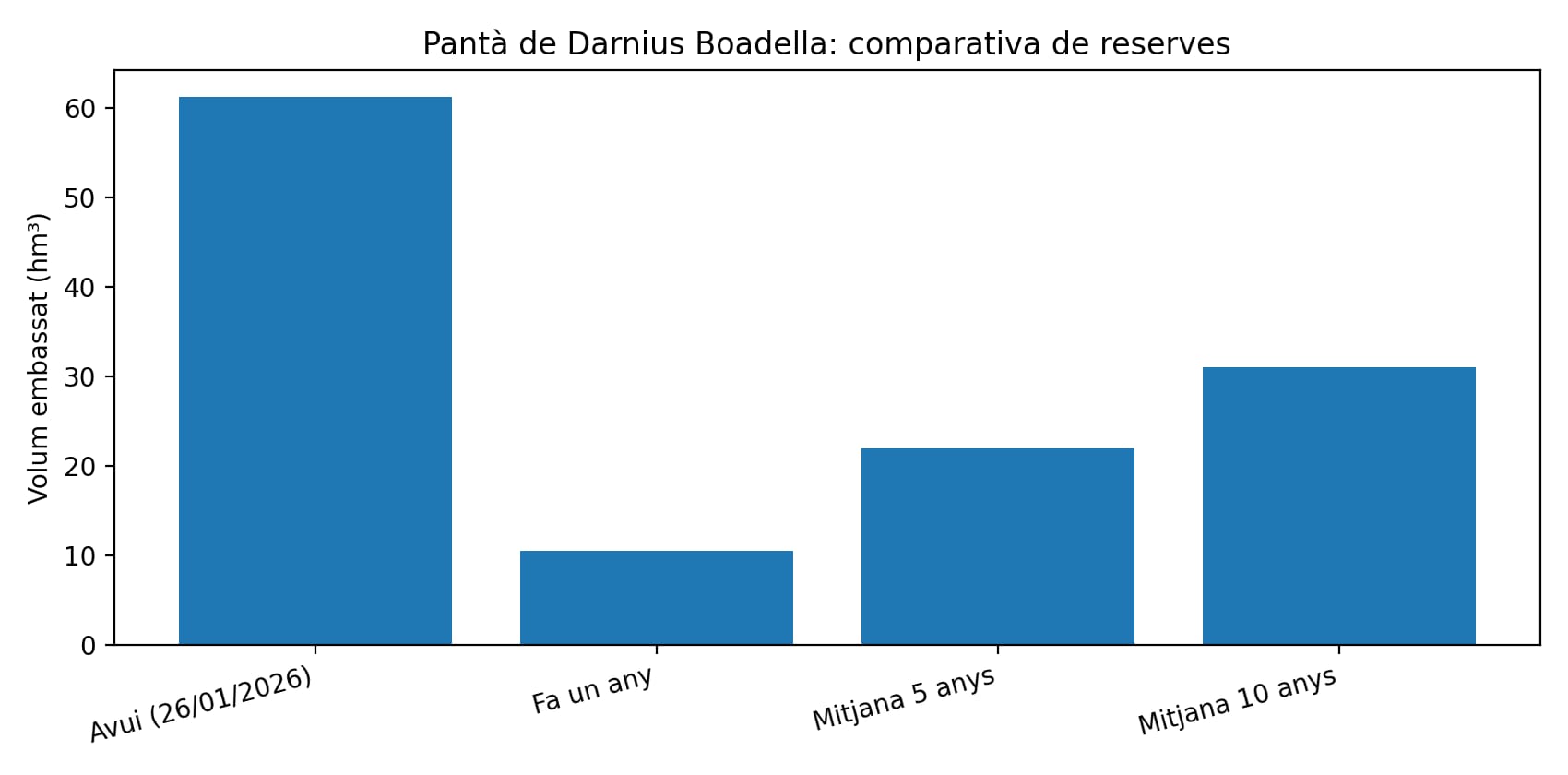 Comparativa (dades oficials de l’ACA): volum embassat avui, fa un any i mitjanes.